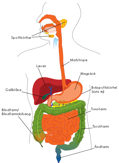 Klicka på den del av mag- och tarmkanalen som du är intresserad att veta mer om.